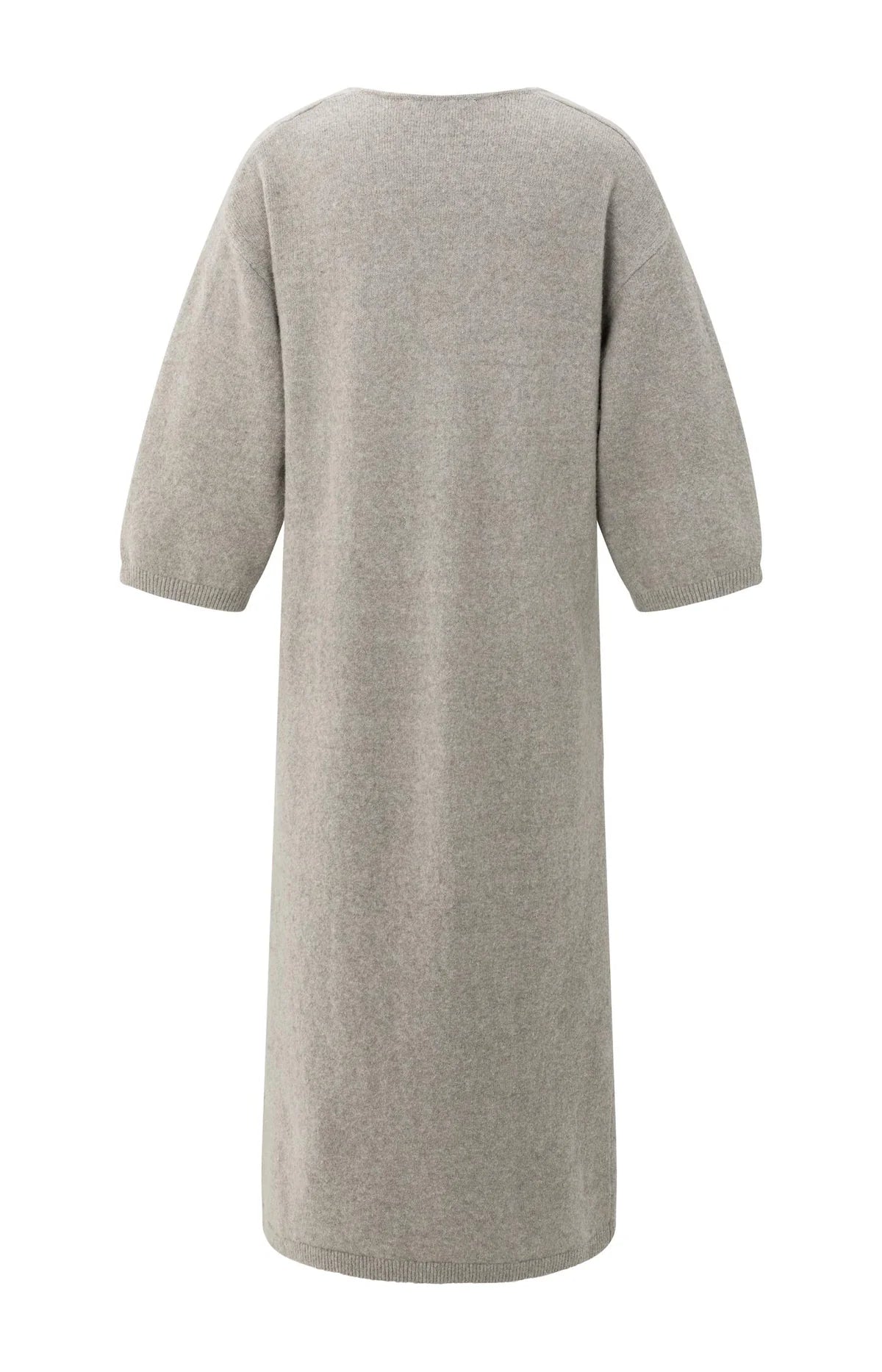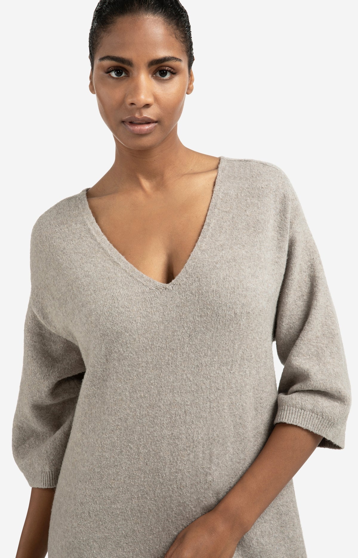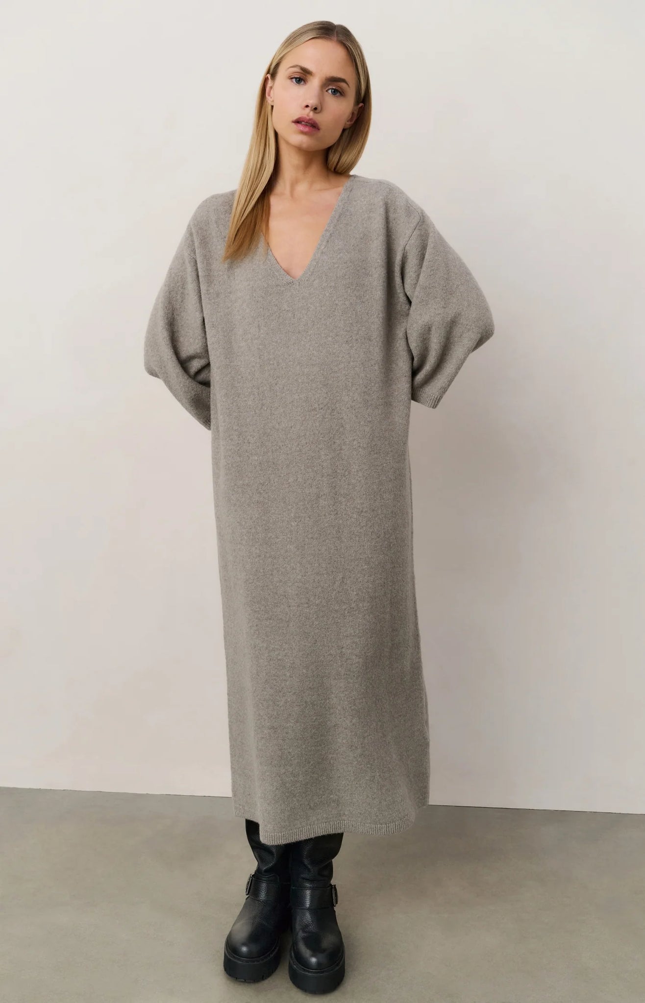 This comfortable knitted dress is made from a soft fabric and features a V-neck, short sleeves and a loose fit. The finely ribbed cuffs add a refined touch. A versatile piece with an elegant look, perfect for relaxed days as well as casual occasions. The model is 175 cm and wears size S.