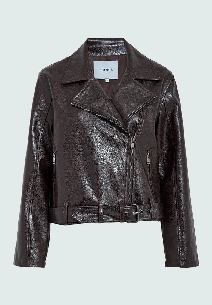 Elevate your fall wardrobe with the Dorothea Jacket in a rich coffee toned faux leather. This jacket blends timeless style with a bold autumnal shade, offering a sleek, edgy look. Perfect for layering, its smooth faux leather finish adds sophistication while keeping you comfortable on crisp fall days. Make a statement this season with a versatile jacket designed to enhance your everyday outfits.