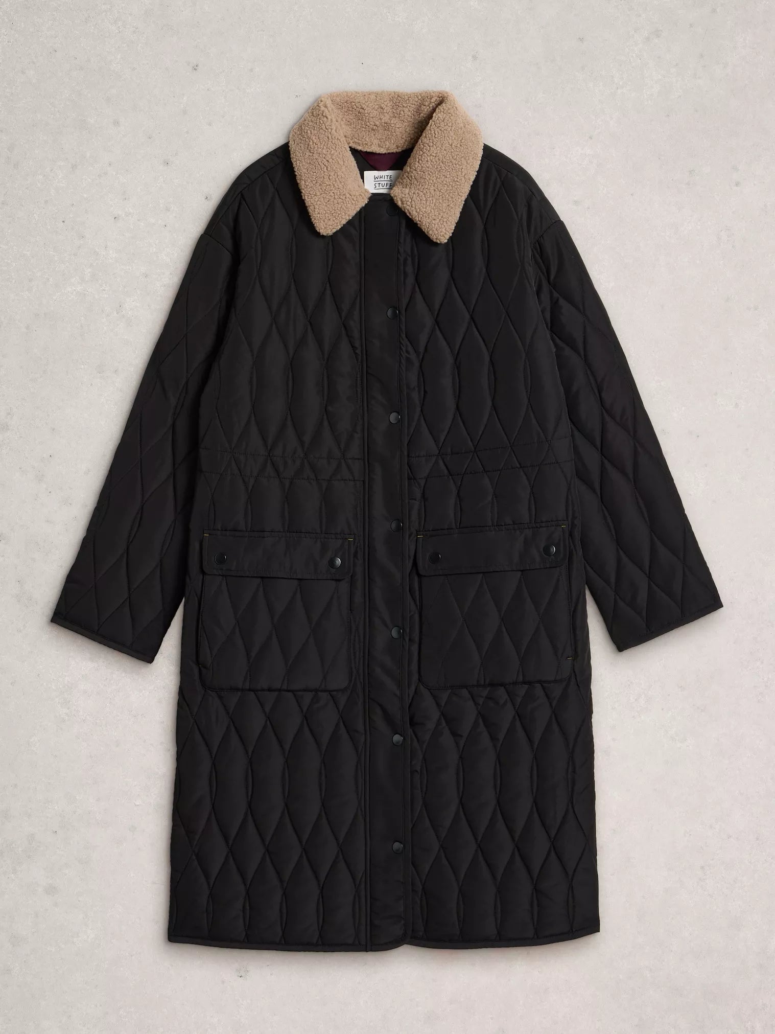 Like wearing your duvet outside. But a lot more stylish. This long quilted coat is made with 100% recycled polyester, and has front pockets and a handy waist adjuster. Not feeling the borg collar? Attach and detach as you please.