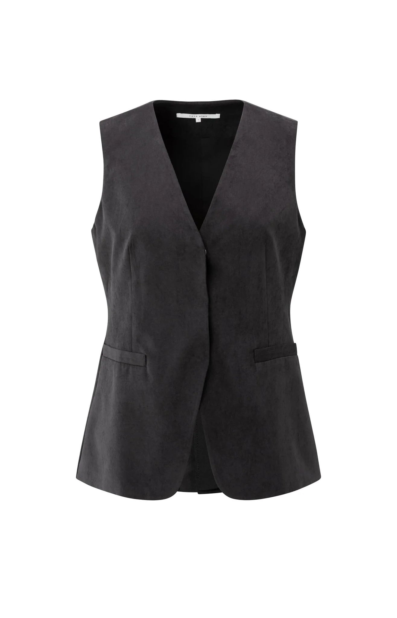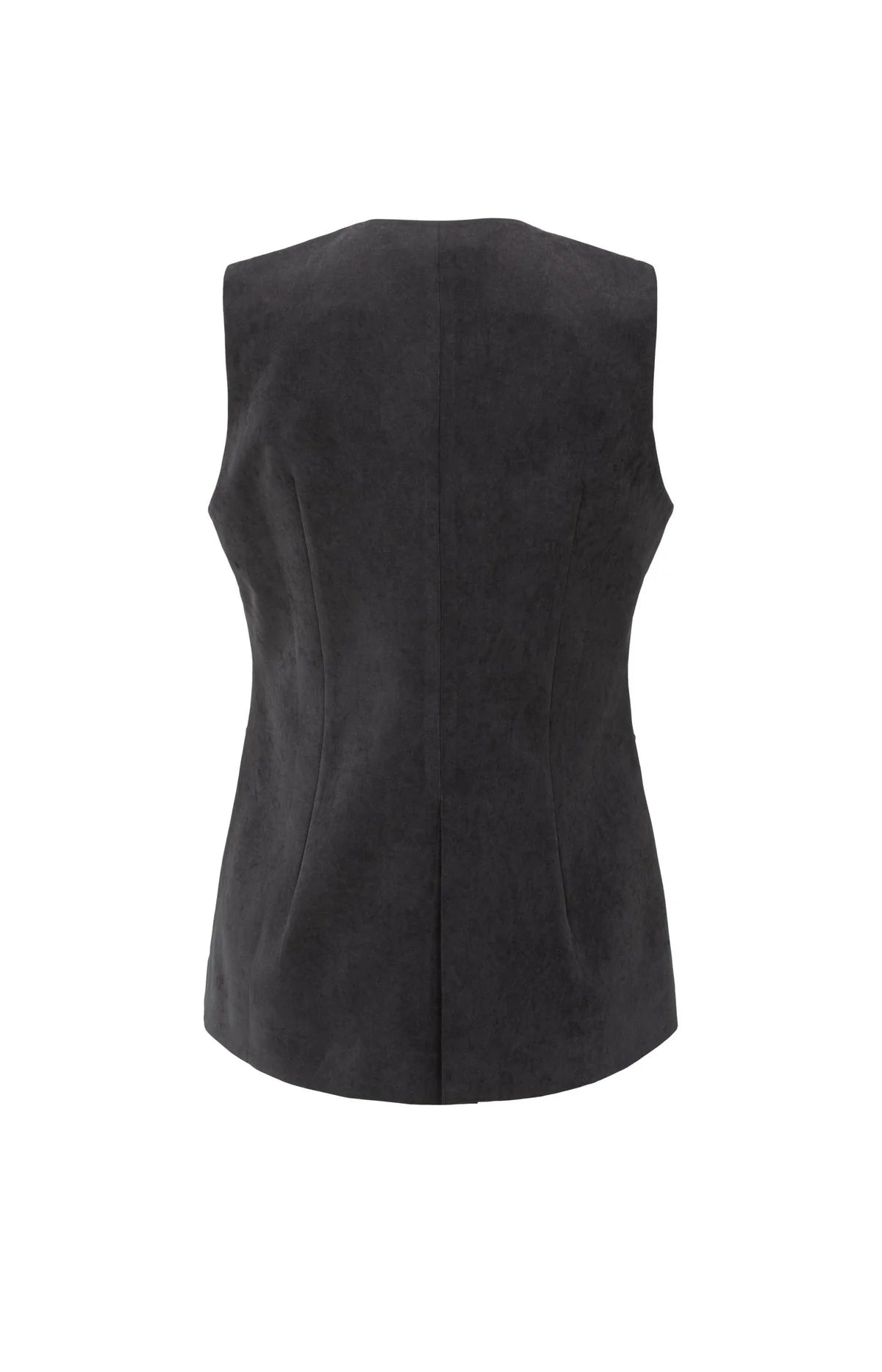 This stylish gilet is crafted from soft suedine and features a fitted silhouette. Designed with decorative seams, a hidden closure and faux flap details. Wear it over a blouse or dress for a layered, feminine look. The fabric feels soft and comfortable, offering a luxurious touch. The model is 178 cm and wears size 36.