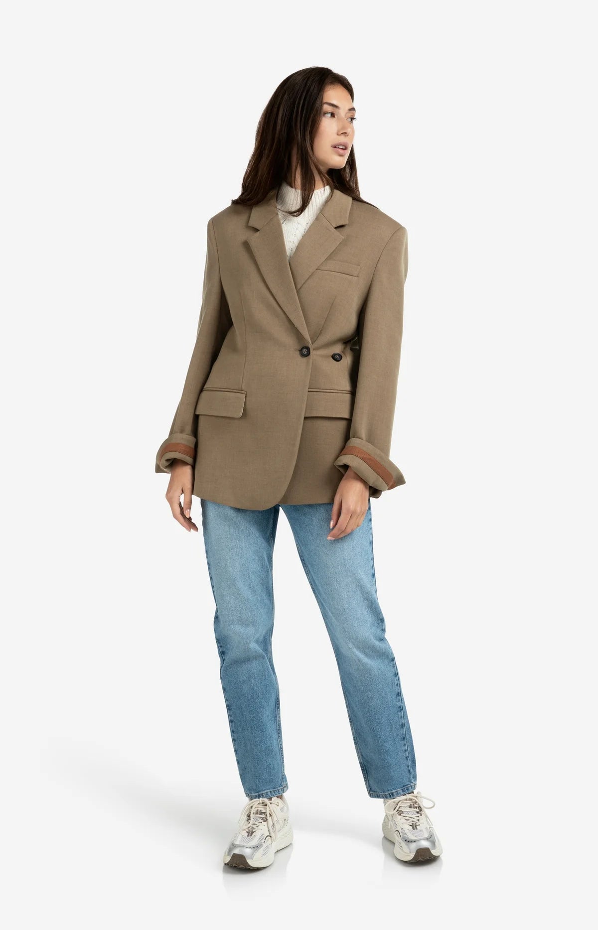 This oversized blazer is crafted from a woven fabric and features a classic lapel collar, double-button closure, and flap pockets. The sleeves are finished with a subtle decorative tape for an elegant touch. Designed with a straight, loose fit, its the perfect piece for a stylish, casual or office-ready look. The model is 175 cm and wears size 36.