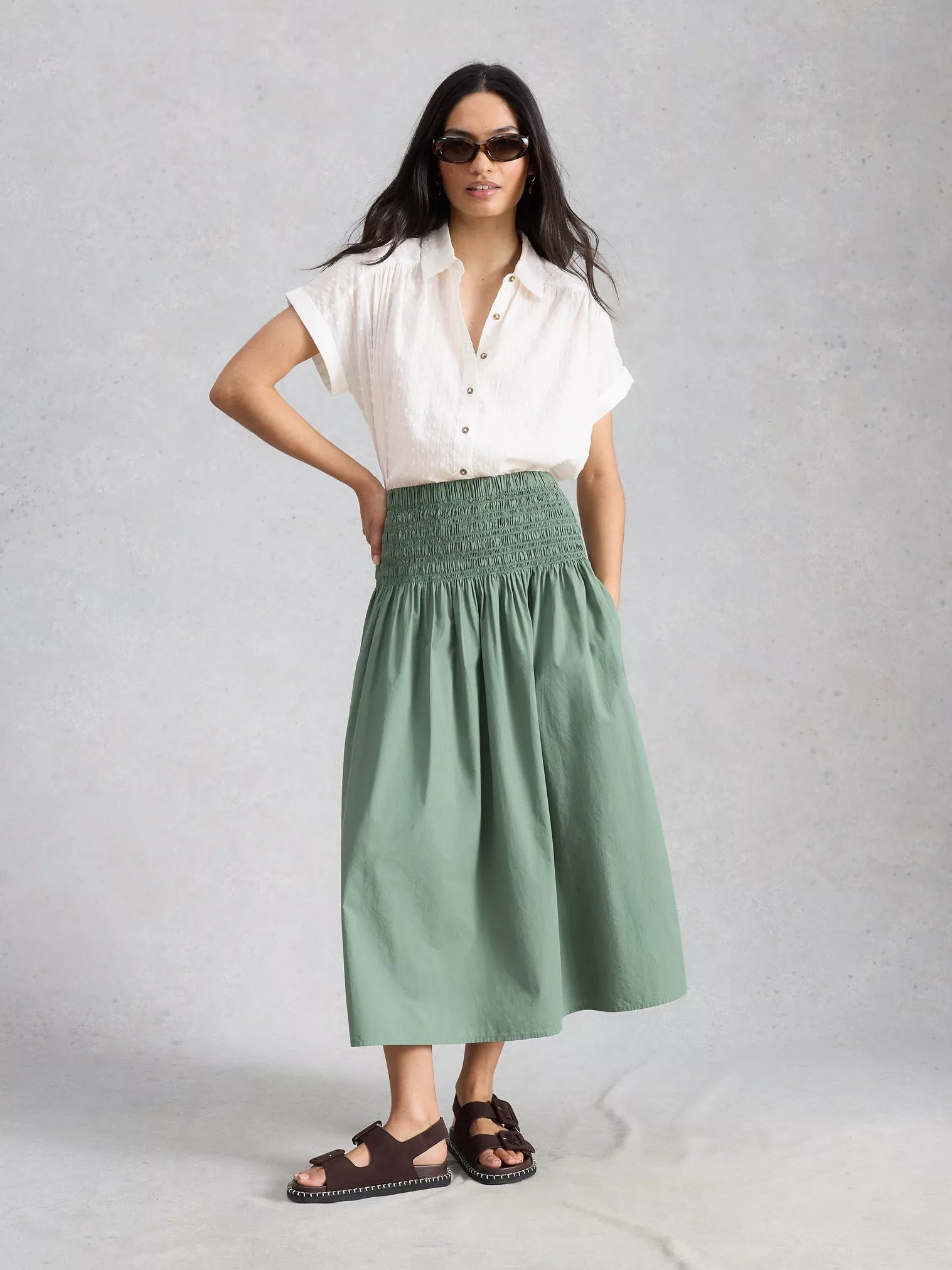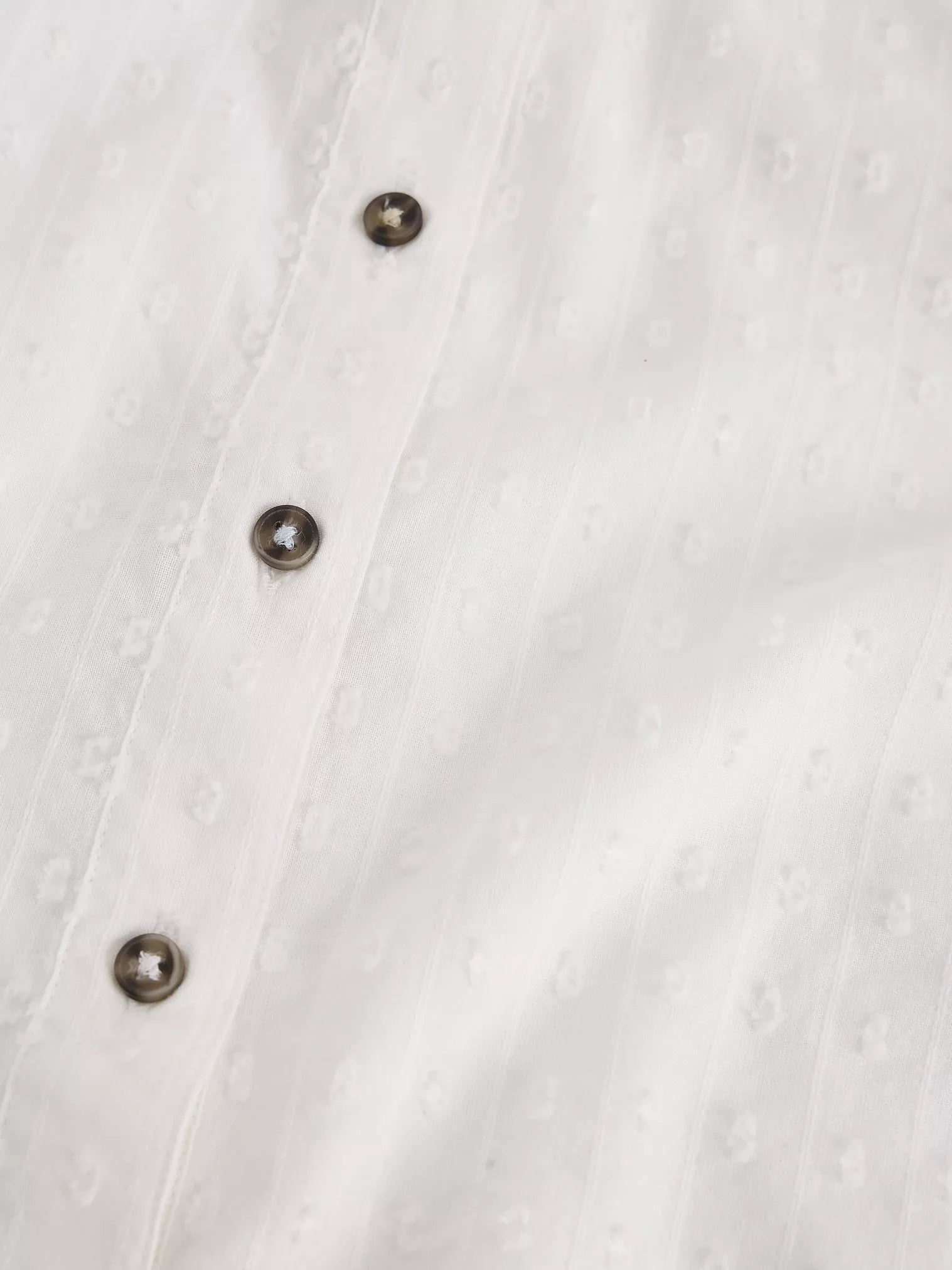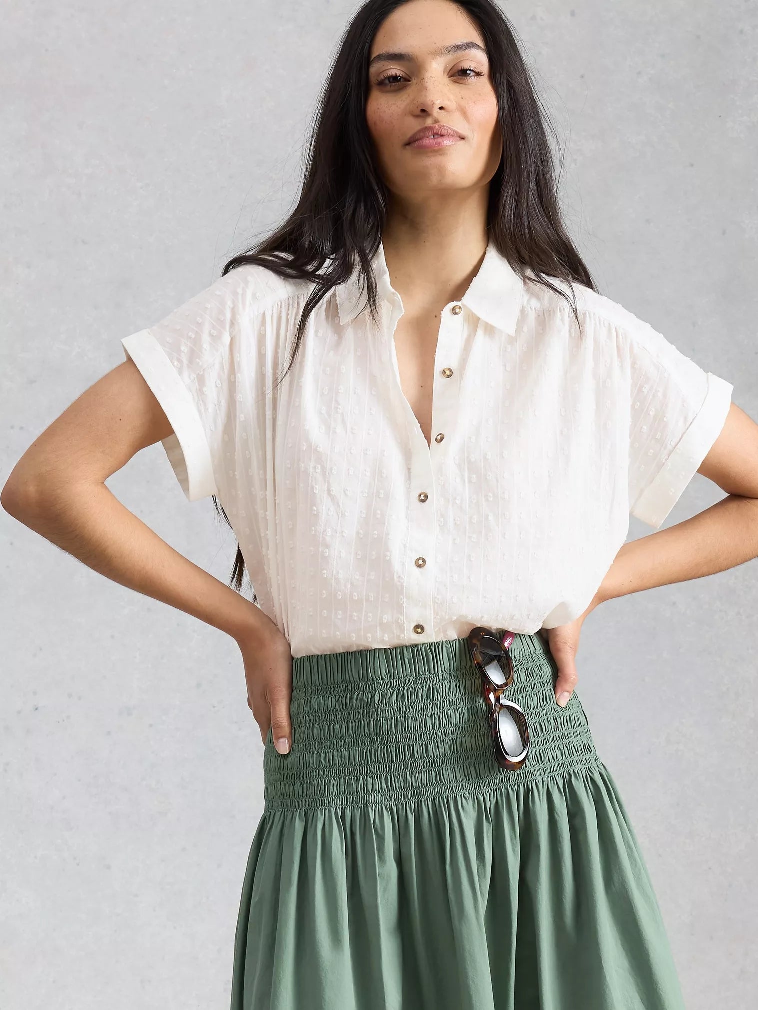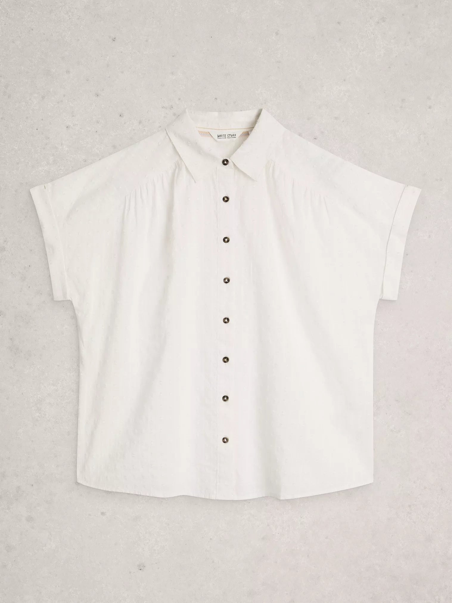 The Orla shirt is relaxed. (Almost as relaxed as you’ll feel wearing it.) It’s made from soft organic cotton, so it’s cool and breezy. And the easy, short sleeved shape is perfect for buttoning up and tucking into denim. Or wearing loose, layered over a tank top.
