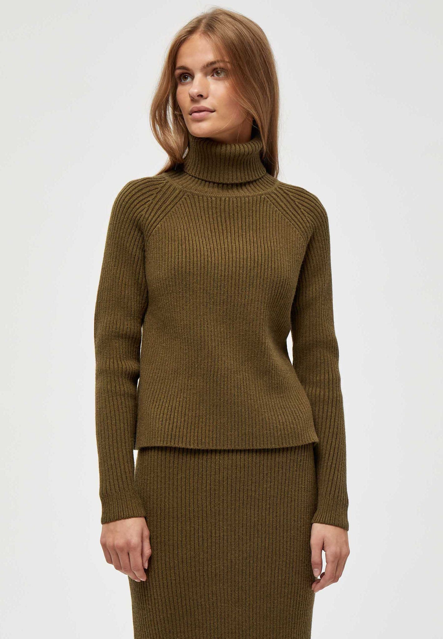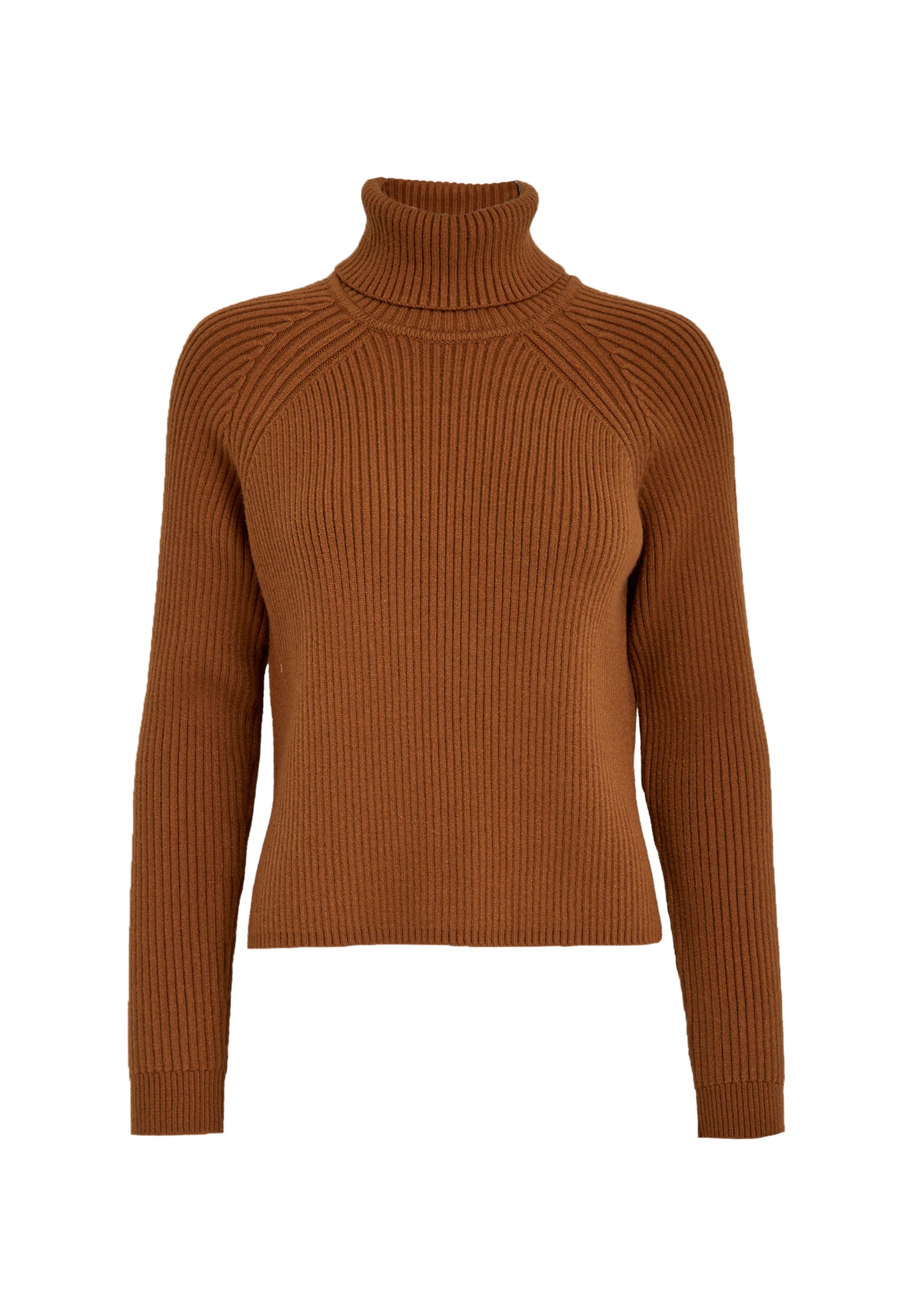 A lovely knit turtleneck with ribbed detail and slits on both sides. The knit is made from 52% EcoVero viscose which is a sustainable material, that is more gentle to the environment compared to normal viscose. It is easy to style and the ginger tone is perfect for autumn outfits.