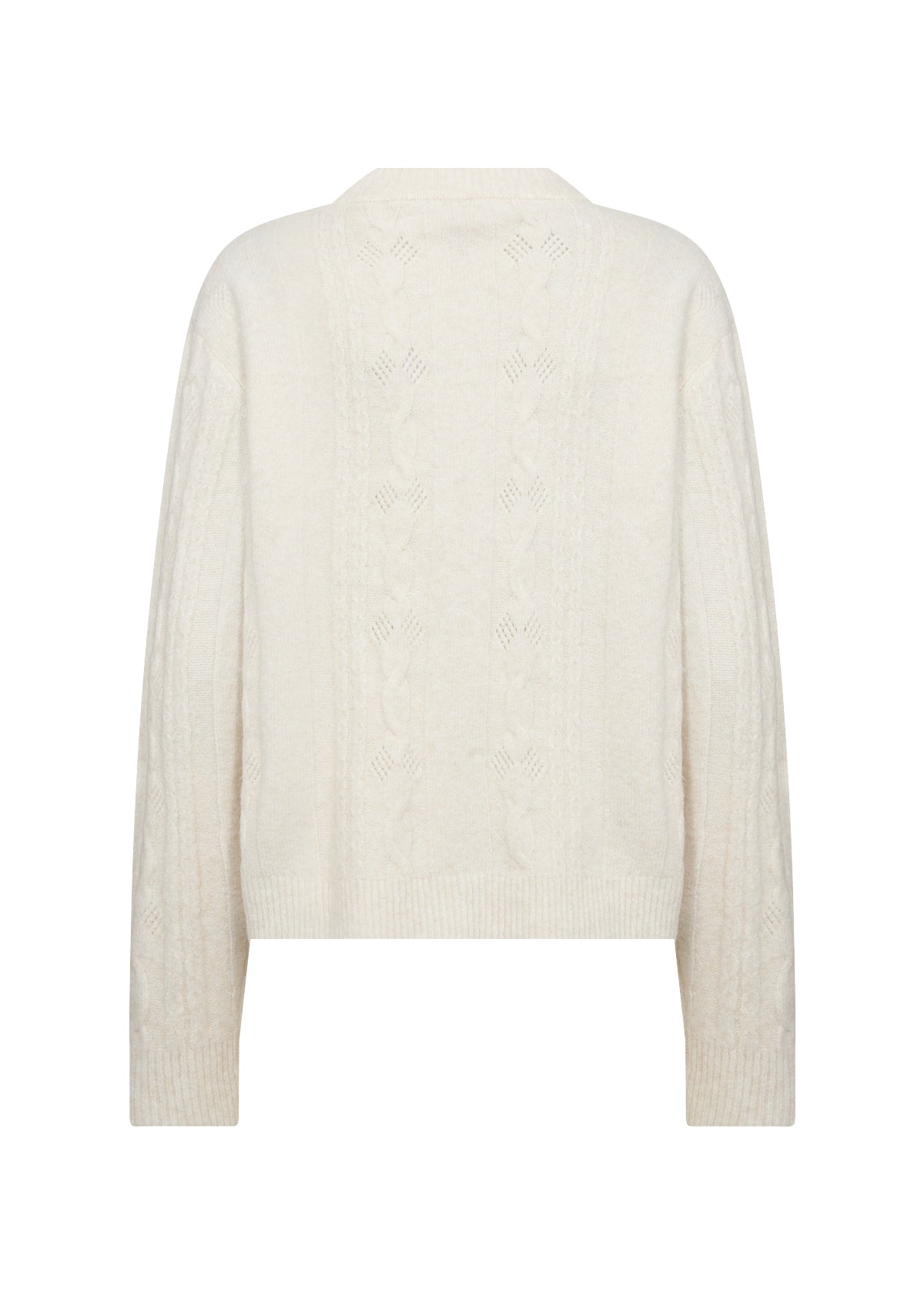 This cozy sweater features a cable knit pattern, ribbed cuffs, and a round neckline. Pair it with denim or tailored trousers for a comfortable outfit.