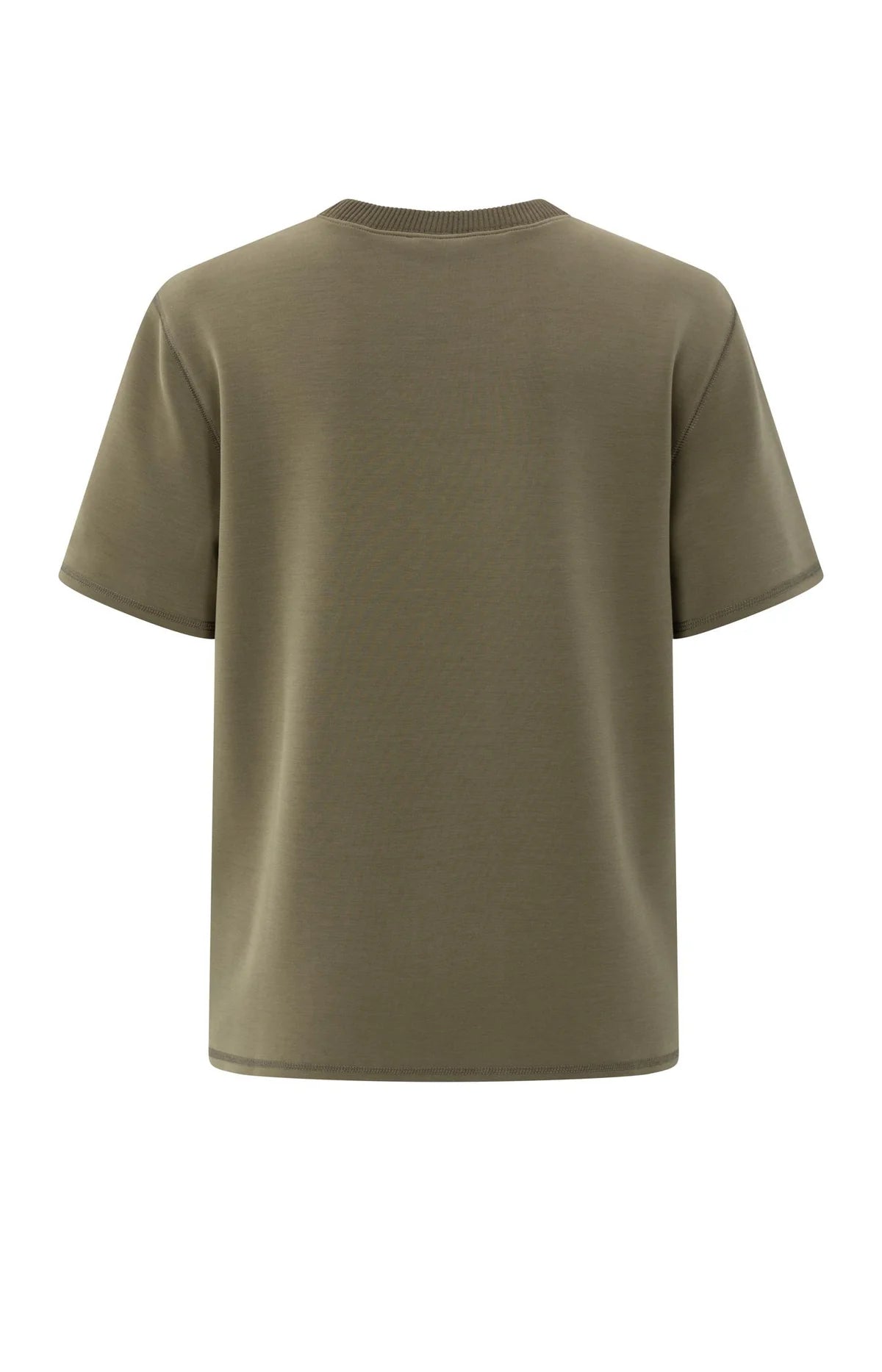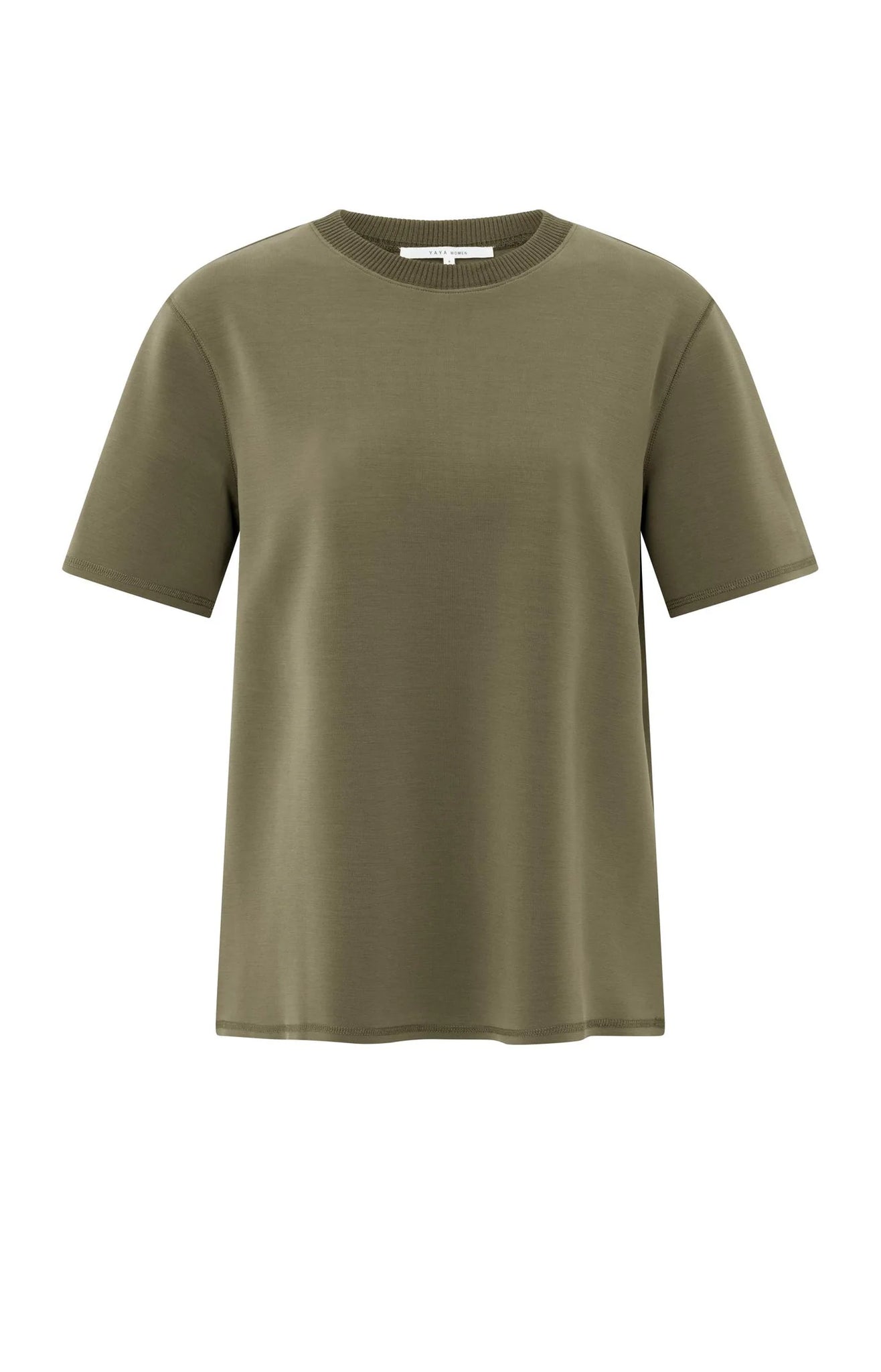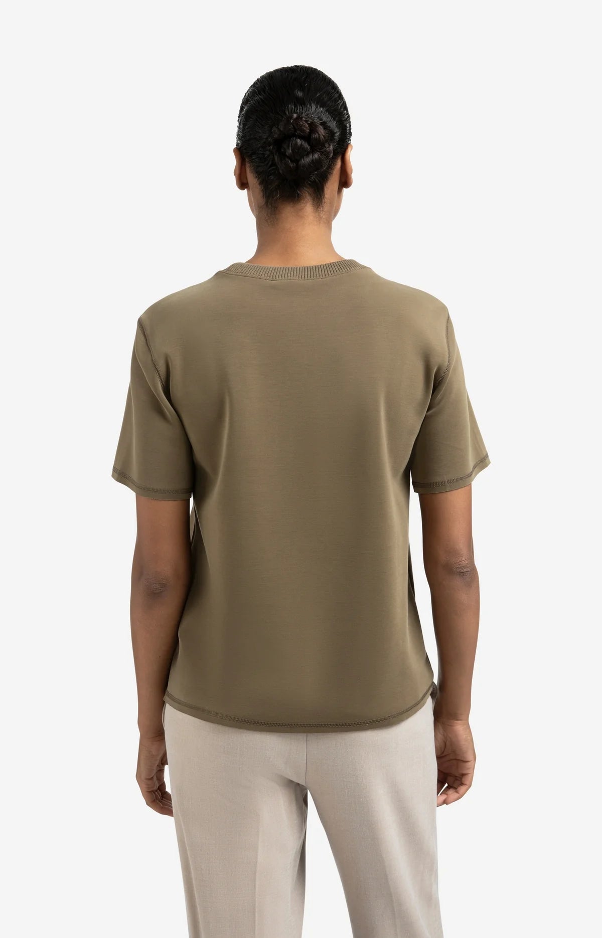 This modern T-shirt is made from a smooth, structured fabric and features short sleeves and a regular fit. The ribbed knitted neckline adds a subtle touch to the minimalist design. Thanks to its comfortable feel and clean finish, this piece is perfect for a casual yet elegant look. The model is 176 cm and wears size S.