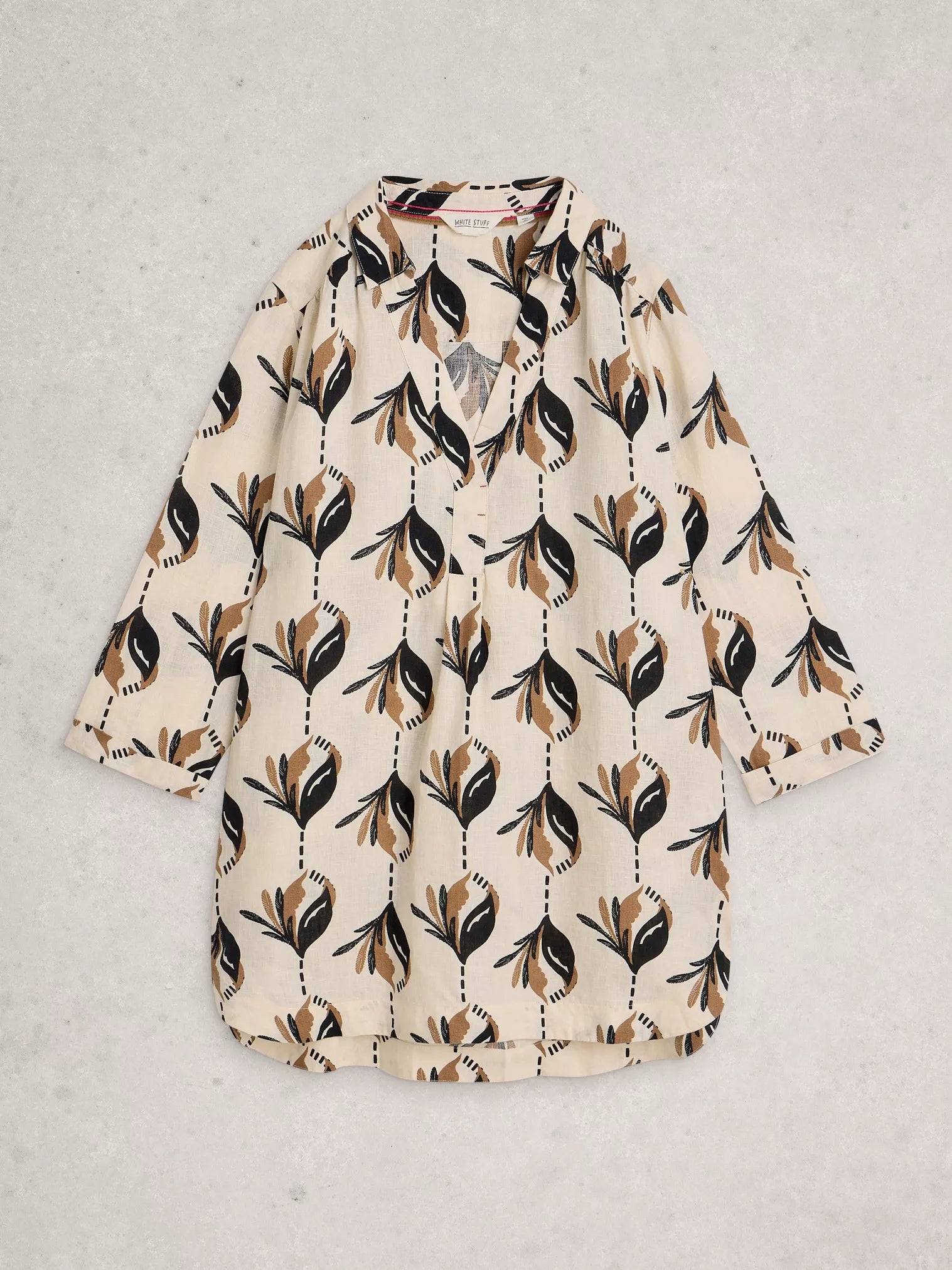 Give your top collection a refresh with this linen blend tunic. It's got a notch neckline, 3/4 length sleeves and a relaxed fit. Wear yours with jeans and and easy sandals.