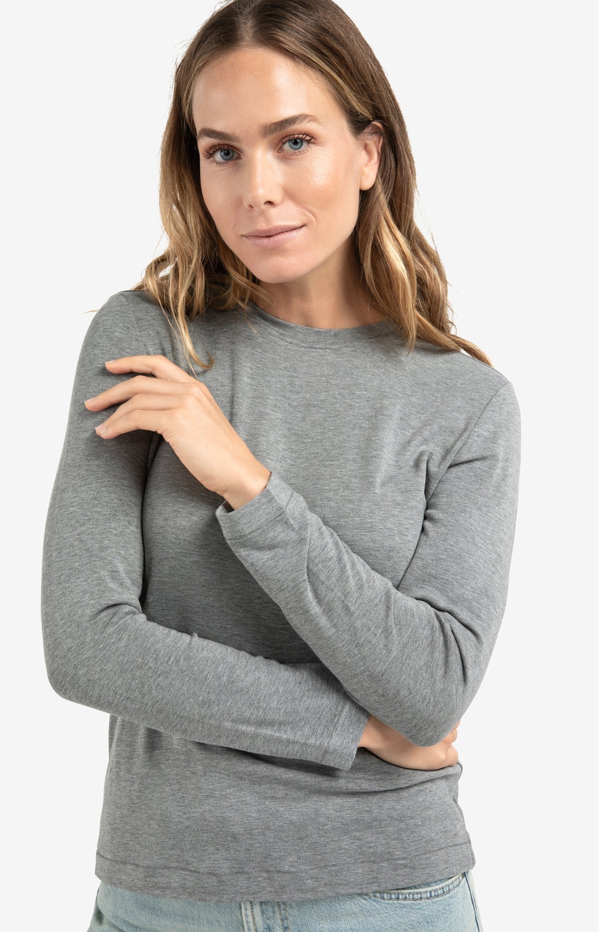 This essential top is made from a sturdy jersey fabric that feels soft and holds its shape beautifully. Designed with a round neckline, long sleeves, and a straight fit. Perfect to wear on its own or layered on cooler days. A comfortable and versatile wardrobe staple for everyday wear. The model is 178 cm and wears size S.