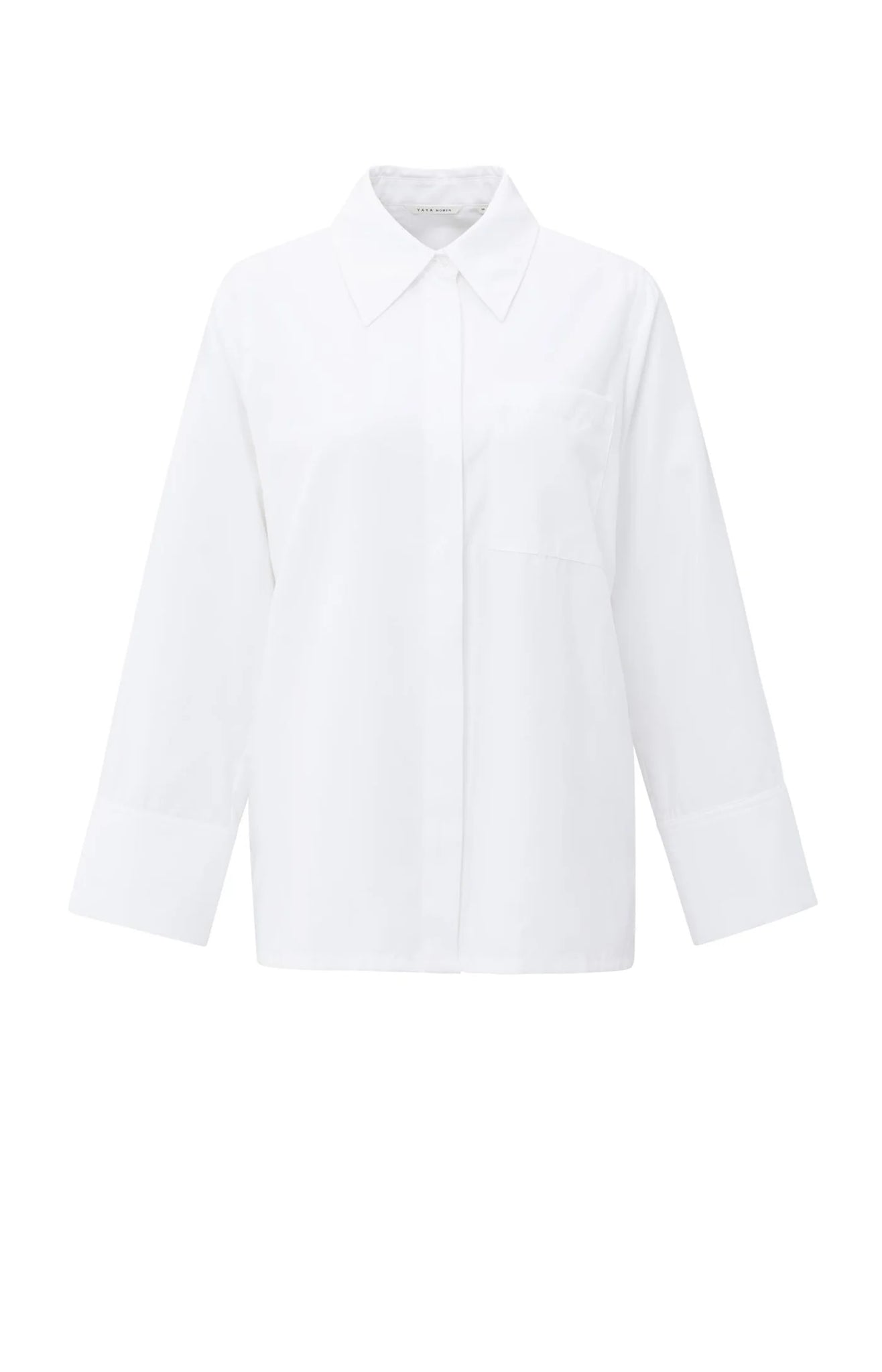 This soft oversized blouse is crafted from a crisp cotton blend and features long wide sleeves with structured cuffs, a classic collar and a chest pocket. The relaxed fit adds a casual elegance, making it perfect to wear both tucked in or loose. A versatile basic with a timeless look for any season. The model is 178 cm and wears size 36.